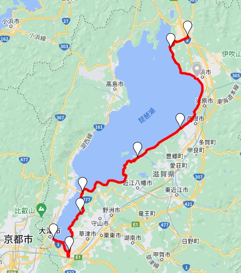 コースはこんな感じで琵琶湖の南端から東側を北上していく感じです。